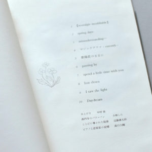 レーベル・オーナーkei nakamuraによる詩集 “”虚ろげな日々の断片” ~ Recueil de poèmes extrêmement privé ~”を7/10にリリース。詩に併せた全編で挿絵を小林しの、またそれに付随する幾つかの音源を小林しの、近藤健太郎(the Bookmarcs/the Sweet Onions)、高口大輔(the Sweet Onions) がそれぞれ楽曲にし6曲入りで付属。マスタリングは小園兼一郎(small garden studio)、ブックデザインは荒澤文香が担当。初回100部限定で小林しのによるポストカードが付属する。