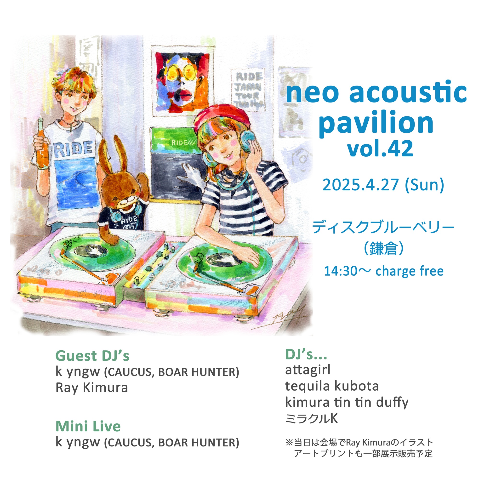 【インストア告知】4/27(日) “neo acoustic pavilion vol.42″開催のお知らせ イベント/ライブ 2025.04.14 “neo acoustic pavilion vol.42” 2025.4.27(Sun) 14:30〜 charge free ▶ Guest DJ’s Ray Kimura k yngw ▶ mini live k yngw(CAUCUS、BOAR HUNTER) ▶ DJ’s attagirl tequila kubota kimura tin tin duffy ミラクルK 当日はRay Kimuraさんのイラストアートプリントも一部展示販売予定。 〜タイムテーブル〜 ディスクブルーベリー(鎌倉)への行き方 JR鎌倉駅より徒歩10分 , 江ノ電・和田塚駅より徒歩30秒